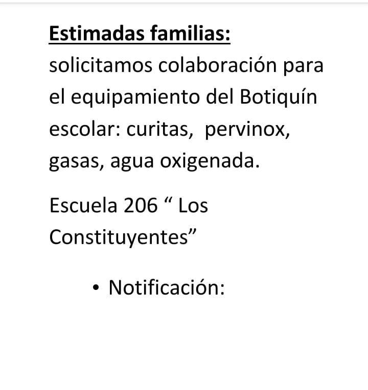 En la Escuela 206 Los Constituyentes ya hemos visto como sufren la falta de los insumos para higiene y limpieza que no manda el gobierno. Ahora, a una semana de iniciadas las clases, tienen que pedir nuevamente la colaboración de los padres, la escuela pública tampoco tiene elementos para el esencial cuidado de la salud y piden la colaboración para armar un botiquín.