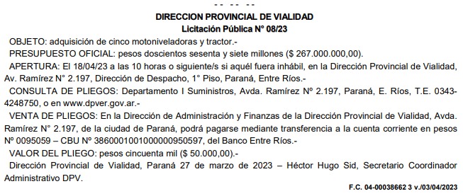 Bajo la figura de Licitación Pública, desde Vialidad Provincial el gobierno entrerriano decidió comprar motoniveladoras y un tractor, par lo que van a gastar $ 267 millones, que luego de adjudicado seguro tendrá el reajuste por inflación.