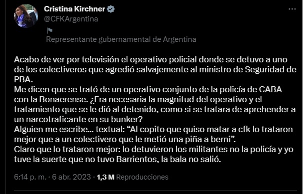En la publicación reflejada en su cuenta de Twitter, Cristina Kirchner cuestionó en los mismos términos a la fuerza metropolitana como a la bonaerense por la manera en la que se llevaron detenido a uno de los acusados por el ataque al ministro.