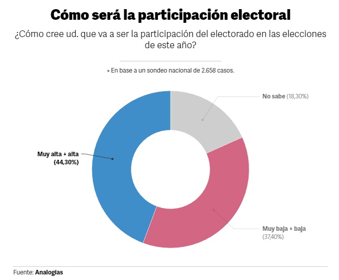 «Respecto a la participación electoral de este año el 44% de los encuestados prevé que será ‘Alta o Muy Alta’, el 37% que será ‘Baja o Muy Baja’ y, otra vez, son los encuestados de opiniones oficialistas los que más expectativas tienen respecto de una participación alta en las elecciones».