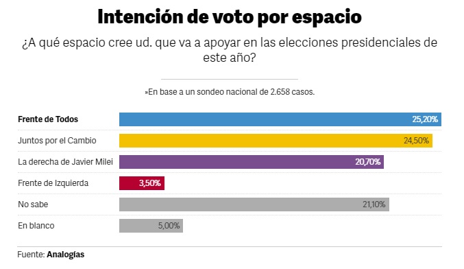 El Frente de Todos «de Alberto y Cristina» aparece adelante con el 25,2%, seguido por Juntos por el Cambio «de Macri, Bullrich y Larreta» con 24,5% y por «la derecha de Javier Milei» con 20,7%. En el medio se cuelan los indecisos («no sabe»), con 21,1%. Y completan «en blanco» 5% y Frente de Izquierda 3,5%.