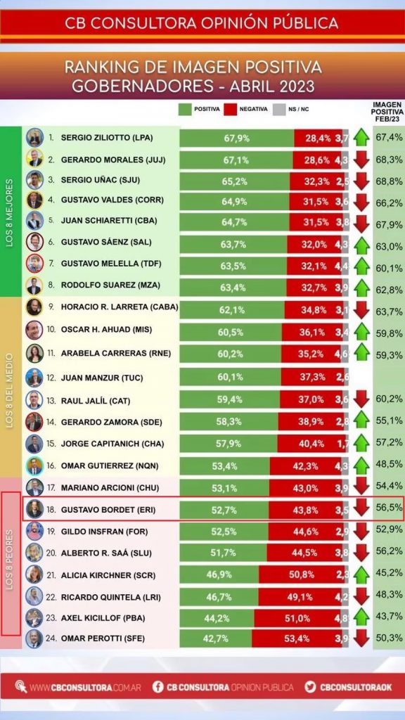 De acuerdo a la encuesta elaborada por CB Consultora, amigos y con resultados llamativamente siempre favorables al ejecutivo provincial, Bordet sigue en caída y aumenta su imagen negativa, y lo pone dentro de los peores gobernadores del país.