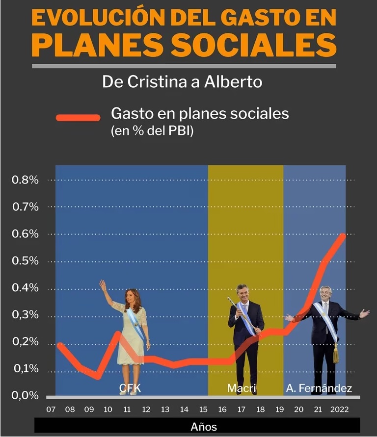 Cristina Fernández de Kirchner, que venía manteniendo la cantidad de planes sociales, comenzó a aumentarlos a partir de la crisis económica generada entre 2008-2009 debido al colapso de la burbuja inmobiliaria en los Estados Unidos. En 2010 los duplicó. Treparon a poco más del 0,2% del PBI y bajaron al 0,12% al final de su segundo mandato, en diciembre de 2015. A partir de la llegada de Mauricio Macri a la Casa Rosada, entre el 10 de diciembre 2015 y 10 de diciembre de 2019, los planes se aceleraron al ritmo de los reclamos que los entonces piqueteros opositores del Movimiento Evita, junto a los de izquierda del Polo Obrero.