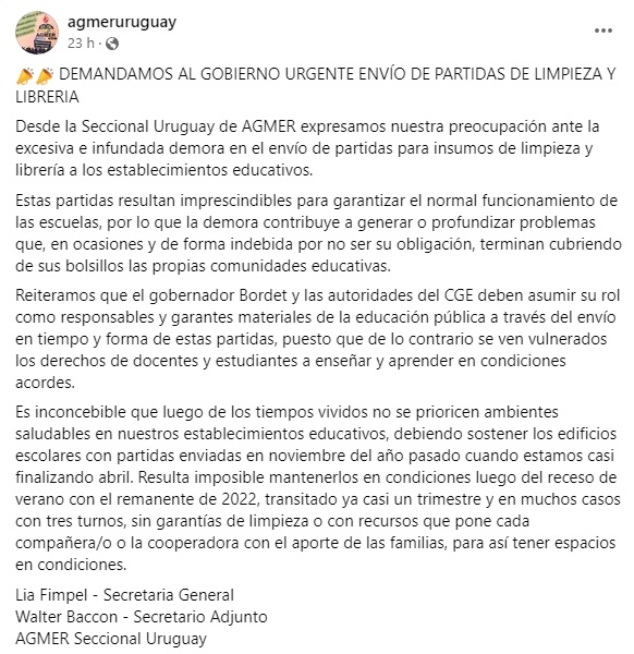 Los docentes axpusieron que «es imposible imposible mantener los establecimientos en condiciones luego del receso de verano con el remanente de 2022, transitado ya casi un trimestre y en muchos casos con tres turnos, sin garantías de limpieza o con recursos que pone cada compañera/o o la cooperadora con el aporte de las familias, para así tener espacios en condiciones», denunciaron desde AGMER Uruguay.