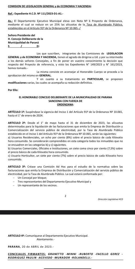 Según los concejales presentes, se realizó un amplio debate en el que se acordó entre Minni, Facello, Granetto, Ruberto, Murador, Rodríguez Paulin, Rolandelli y Acevedo, con la ausencia de Bauzá, reducir un 50% la tarifa eléctrica. Además, la Concejala Acevedo propuso la creación de una comisión ‘ad hoc’ para el seguimiento de la efectiva reducción y un eventual debate que permita seguir discutiendo el costo.