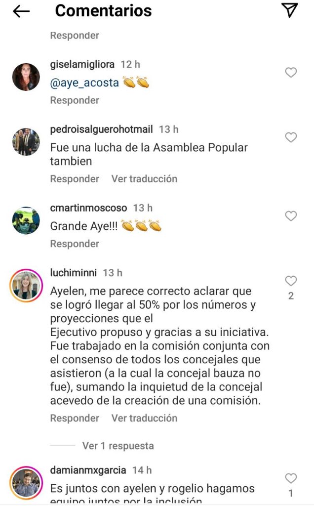 Por estas horas, hay mal estar en el HCD por el oportunismo político de Bauzá y Acosta queriendo hacer propio algo en el que ni siquiera fueron a discutir, algo que les recordó la concejal Minni a través de las redes sociales, donde le recuerda a Acosta que Bauzá no estuvo en la Comisión. «Ayelen, me parece correcto aclarar que se logró llegar al 50% por los números y proyecciones que el Ejecutivo propuso y gracias a su iniciativa. Fue trabajado en la comisión conjunta con el consenso de todos los concejales que asistieron (a la cual la concejal bauza no fue), sumando la inquietud de la concejal acevedo de la creación de una comisión», escribió Minni en la publicación donde Acosta habla del logro del proyecto.