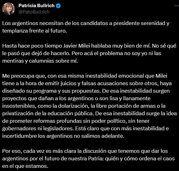 “Los argentinos necesitan de los candidatos a presidente serenidad y templanza frente al futuro. Hasta hace poco tiempo Javier Milei hablaba muy bien de mí. No sé qué le pasó que dejó de hacerlo. Pero acá el problema no soy yo ni las mentiras y calumnias sobre mí. Me preocupa que, con esa misma inestabilidad emocional que Milei tiene a la hora de emitir juicios y falsas acusaciones sobre otros, haya diseñado su programa y sus propuestas”, introdujo Bullrich en un extenso mensaje difundido en redes sociales.