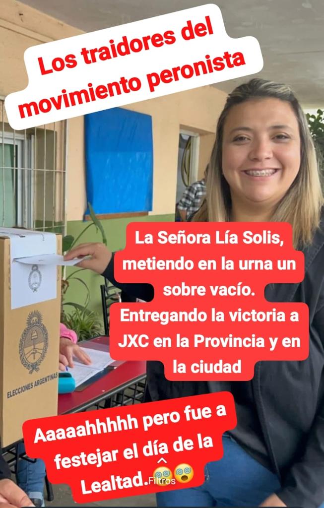 Y como corolario, el meme que también se viralizó, es el de la concejal y MANO DERECHA de Giano, Lía Solís, también votando con un sobre FINITO, cuando las boletas de estas elecciones abultaban de manera notoria el sobre. Parece que Lia se sintió muy aliviada de no tener que batallar para ensobrar su voto y sonríe para la cámara mientras sufraga, evidentemente no por todos los candidatos del peronismo, sino que, seguramente, al igual que Giano, por el candidato a intendente de Juntos, y sin votar a nadie de los candidatos del peronismo.