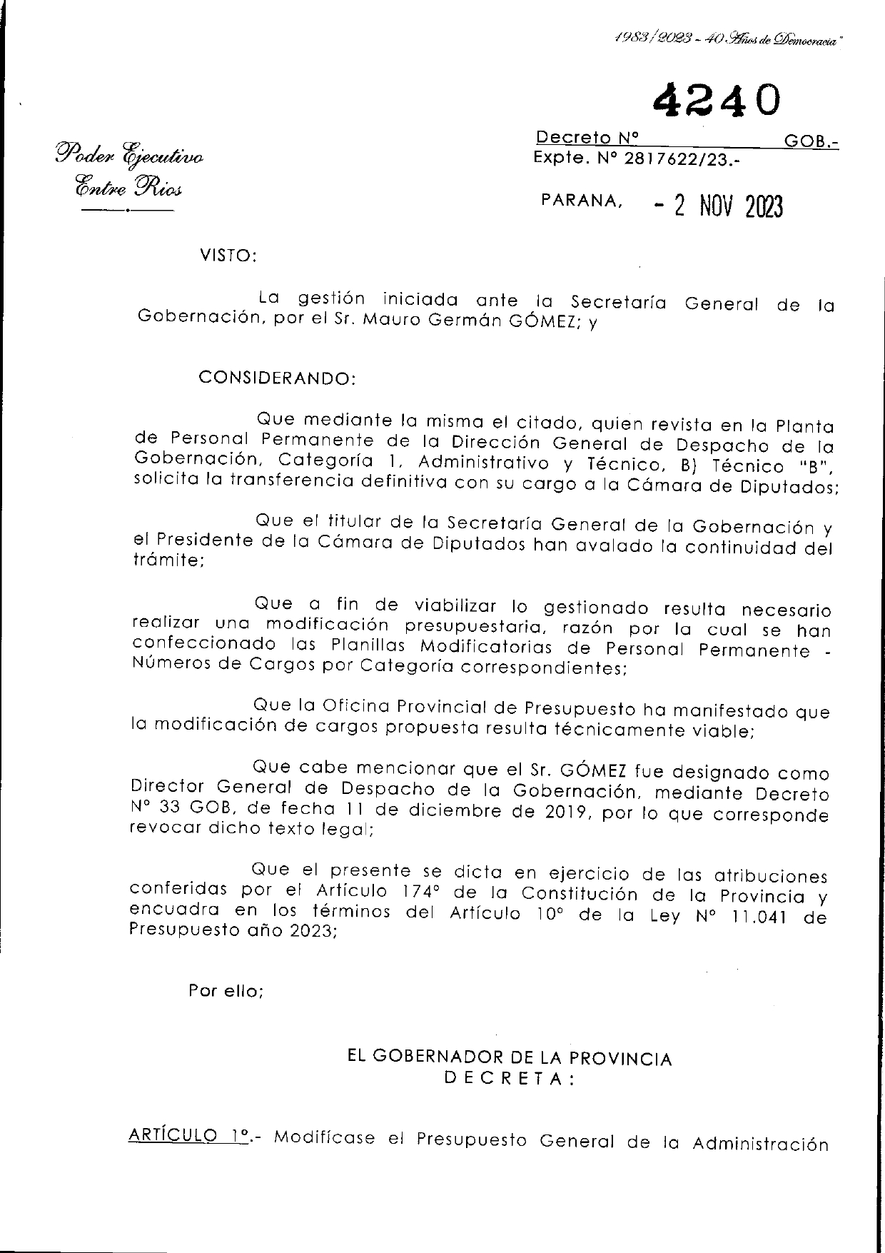 El decreto en cuestión es el N° 4420 con fecha 2 de noviembre de 2023. Existe, aunque no se lo pueda encontrar. No es de acceso público, el pueblo, la ciudadanía, no tiene posibilidad de tener acceso a ese documento, lo que es un derecho. En una movida que se puede calificar como ladina, este decreto, como tantos otros, son movidos de oficina en oficina, llevados de manera personal, con la complicidad de unos pocos, para darle formato oficial, SIN INGRESARLO AL SISTEMA, y que no sea registrado.