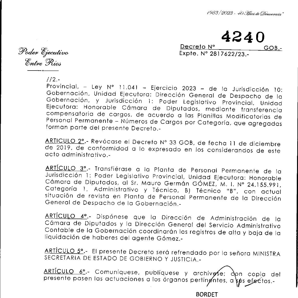 A pesar de estar en RETIRADA, el gobierno de Bordet y Stratta NO RETIRA a quienes los han secundado durante la gestión, ya que a un gran número les han conseguido refugio permanente en puestos muy bien remunerados, y ahora se suma otro nombramiento más, hecho a través de un decreto fantasma, de esos que nadie ve, pero existen.