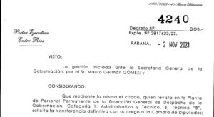 CompartirA pesar de estar en RETIRADA, el gobierno de Bordet y Stratta NO RETIRA a quienes los han secundado durante la gestión, ya que a un gran número les han conseguido refugio permanente en puestos muy bien remunerados, y ahora se suma otro nombramiento más, hecho a través de un … Sigue leyendo Gobierno Transparente? DECRETOS de mano en mano sin pasar por las oficinas que corresponden para no ser descubiertos.