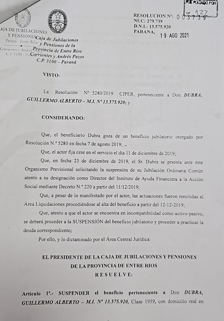 Por la Resolución Nº 5280/2019 de la Caja de Jubilaciones y Pensiones de Entre Ríos (CJPER), del 7 de agosto de 2019, Guillermo Dubrá, Director del IAFAS, fue jubilado como funcionario del organismo y empezó a cobrar ese dinero de manera inmediata, como es costumbre cuando la jubilación es de un funcionario, no como ocurre con los empleados que deben penar durante meses. A pesar de la jubilación, Dubrá siguió cumpliendo labores en el IAFAS, y TAMBIÉN cobrando mes a mes su sueldo actual $ 2.731.840,00 como DIRECTOR del IAFAS, algo que es totalmente contrario a las normas.