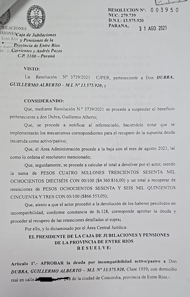 En la Resolución de la CJPER Nº 3739/2021, del 19 de agosto de 2021, RECIÉN aparece que Guillermo Dubrá denunció, como si fuera de MOTU PROPRIO, que estaba cobrando de manera incorrecta una doble suma que no le correspondía por la incompatibilidad activo-pasivo. Durante todo ese tiempo parece que no estaba enterado de que no le correspondía ese doble cobro, siendo que es un funcionario de alto rango, Contador Público de profesión, conocedor de todos los pormenores administrativos.