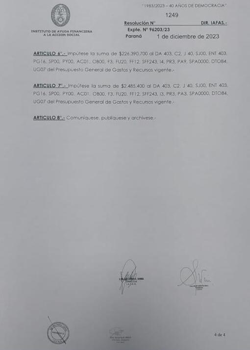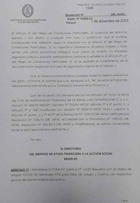 En la Resolución N° 1249 del 1 de diciembre de 2023 la Comisión de Compras del IAFAS aconseja la adquisición a la empresa SLOTS MACHINES S.A. de 8 equipos ATM por U$S 600.000 dólares, más 2 máquinas dispensadoras de billetes por U$S 19.200 dólares, y, además, pagar U$S 40.800 por la prestación de mantenimiento preventivo. La suma total asciende a U$S 660.200 dólares. Suma que debería ser asumida por las empresas privadas que usufructúan el juego en Entre Ríos. OTRA VEZ la empresa favorecida es SLOTS MACHINES, que hace muy poco también fue adjudicada para proveer las máquinas ticketeras ATM, que sirven para canjear dinero por tickets para las maquinas de juego del casino.