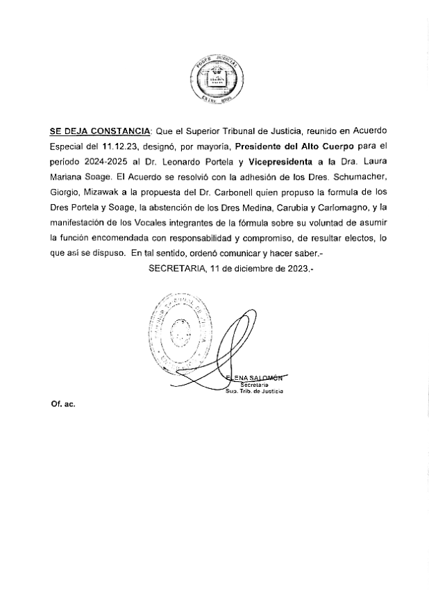 Como presidente del STJER fue designado el vocal Leonardo Portela y como vicepresidenta fue electa la vocal Laura Soage, quienes expresaron su voluntad de asumir la función encomendada con responsabilidad y compromiso.