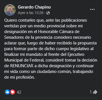 Gerardo Chapino, a través de su cuenta de Facebook, intentó esclarecer y justificar el puesto que le habían asignado en el Senado sin haberlo pisado jamás, y lo más grave aún es que lo acepto mientras aún era intendente en funciones, por lo que a partir de ese momento se convirtió en un funcionario con DOBLE CARGO, y que tendría un sueldo seguro luego de dejar el Ejecutivo de su ciudad.