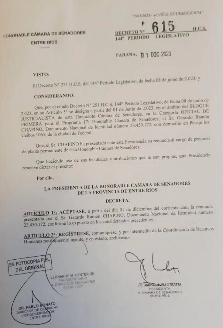 Después de este accionar, de haber aceptado los nombramientos en Plana Permanente, no es motivo de REDENCION que hayan renunciado, porque lo hicieron OBLIGADOS por la presión pública al filtrarse la noticia. Los decretos NO APARECEN. Y lo más llamativo es que Chapino exhibe públicamente el Decreto de su renuncia, PERO NO ESTÁ EL DECRETO DE SU DESIGNACION NI FUE PUBLICADO.
