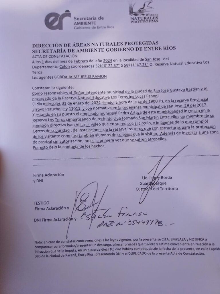 «Hasta el señor Villar sube a sus redes sociales el momento de cuando ingresan, incluso citando el tema “llegamos los pibechorros, al que se haga el vivo, plomo le vamos a dar”, ese tema. Así que bueno, yo el día de ayer, hice el acta para la provincia, donde responsabilizo al intendente y al señor Fanoni, del ingreso de estos simpatizantes y de la comisión directiva del club, denunciando áreas protegidas provincial con testigos, y también de las roturas que hicieron. Y voy a Fiscalía de Colón y hago la denuncia en la departamental. A este señor, que es el simpatizante del club, que se filma, y sube las fotos y postea todo esto, si vos no tenés la bendición de este padrino, no podría estar pasando esto. Porque ¿quién es el responsable en nuestro municipio de que la ley se cumpla? El intendente«, sentenció Borda.