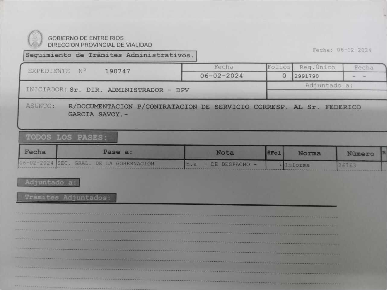 Los pedidos son INICIADOS por el “Sr. Director Administración – DPV”, el flamante director de Vialidad, Exequiel Donda, que mediante estos trámites solicita la contratación de los servicios del Ingeniero Juan Francisco Pereyra EXPEDIENTE Nº190746, y del Sr. Federico García Savoy, EXPEDIENTE Nº 190747. Esto sucede en una Vialidad colmada de nombramientos, atiborrada de empleados que muchos NO tienen tarea que hacer porque el director del área no concurre a trabajar, viáticos de inspecciones inventadas, directores que colocan a familiares, parejas, y hasta el que puso en su oficina a sus dos novias.
