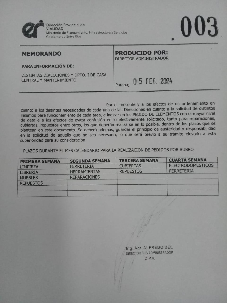 El memorándum tiene fecha del 5 de febrero y tiene la firma del Ingeniero Agrónomo Alfredo Bel, Director Subadministrador de la DPV. Memorándum que redunda y hace hincapié en que las solicitudes sean coherentes, dando a entender que la situación actual de Vialidad no da para el más mínimo despilfarro ni excesos de gastos, consideración entendible en el marco actual de la economía provincial y nacional.