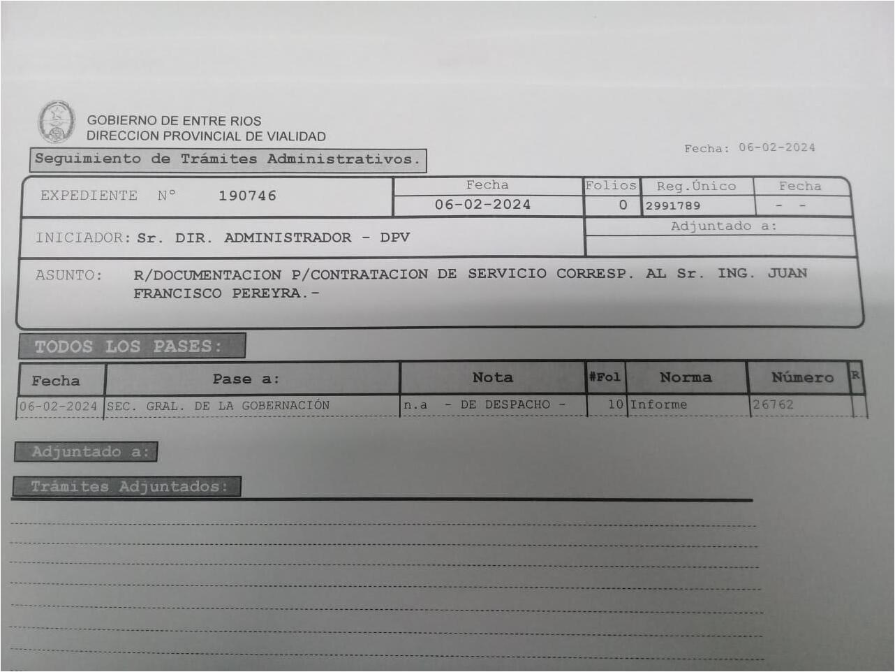 Los pedidos son INICIADOS por el “Sr. Director Administración – DPV”, el flamante director de Vialidad, Exequiel Donda, que mediante estos trámites solicita la contratación de los servicios del Ingeniero Juan Francisco Pereyra EXPEDIENTE Nº190746, y del Sr. Federico García Savoy, EXPEDIENTE Nº 190747. Esto sucede en una Vialidad colmada de nombramientos, atiborrada de empleados que muchos NO tienen tarea que hacer porque el director del área no concurre a trabajar, viáticos de inspecciones inventadas, directores que colocan a familiares, parejas, y hasta el que puso en su oficina a sus dos novias.