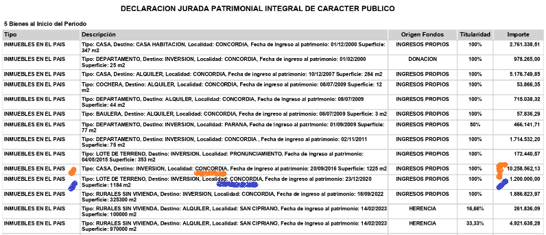 Al menos, y porque ESTÁ OBLIGADO por su cargo actual de Diputado Nacional, presentó una declaración jurada que, no deja de sorprender por el tendal de propiedades que cosechó en los años que fue funcionario. Increíblemente, con un sueldo de la Administración Pública, cuyo mayor monto fue durante su período como Gobernador, U$S 1500 dólares aproximadamente, adquirió departamentos en Concordia y Paraná, campos, y hasta una mega mansión en un lugar exclusivo de Concordia.