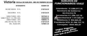 CompartirCarlos Weiss (JxER), intendente de Viale, 10 mil habitantes, sueldo $ 3.1 millones, Rosario Romero (PJ), Paraná, casi 400 mil habitantes, sueldo $ 1.6 millones. Isa Castagnino (PJ), intendenta de Victoria, 40 mil habitantes, sueldo $ 3.1 millones, Bernardo Schneider (JxER), Nogoyá, 43 mil habitantes, sueldo $ 1.6 millones. La intendenta … Sigue leyendo En plena crisis los intendentes de Viale y Victoria se duplicaron el sueldo, superando los 3 millones de pesos.