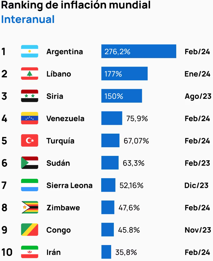 - Argentina volvió a liderar el ranking de inflación de América Latina al anotar una variación de precios del 13,2% en febrero.