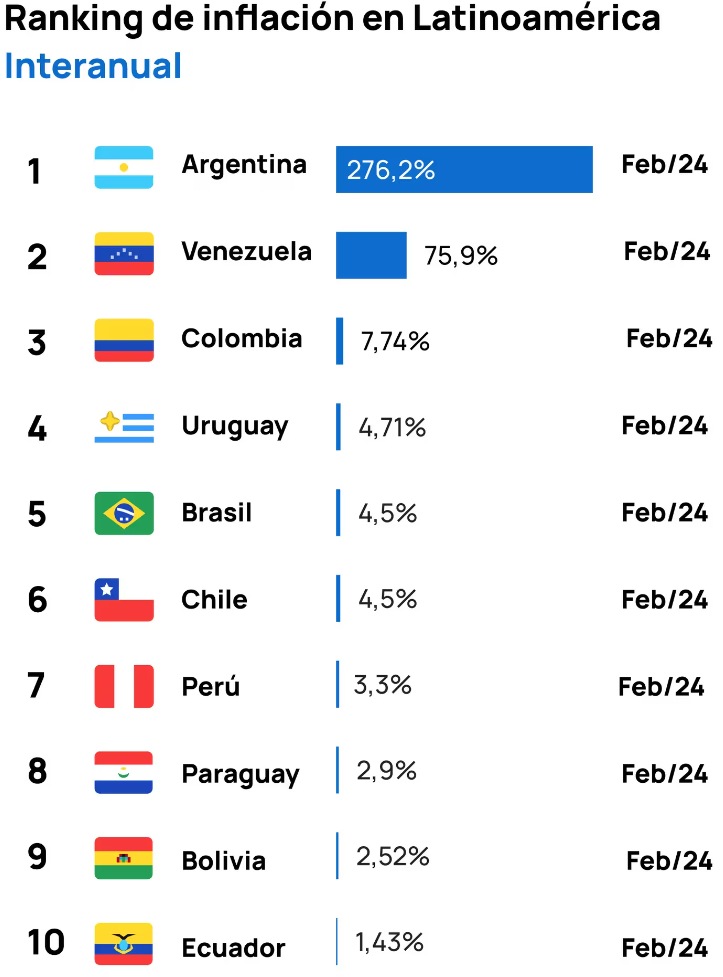 La inflación de febrero en la Argentina fue del 13,2% y lideró por quinta vez consecutiva el ranking entre los países de América del Sur con mayores alzas en sus precios medidos de forma mensual. Además, es el único país de la región que anotó una variación de dos dígitos durante el segundo mes del 2024.