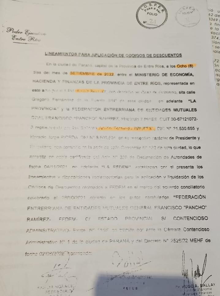 El instrumento provincial titulado «Lineamientos para la Aplicación de Códigos de Descuentos» incluye un punto destacado: el tercero, que detalla que la provincia, ante un reclamo judicial en su contra, llegó a un acuerdo transaccional con FEDEM el 28 de octubre de 2021. Este acuerdo fue ratificado mediante el Decreto Provincial Nº 664/22, emitido el 30 de marzo de 2022. Posteriormente, el 6 de mayo de 2022, se emitió una sentencia judicial que homologó el convenio celebrado el 28 de octubre de 2021 en todos sus términos y cláusulas.