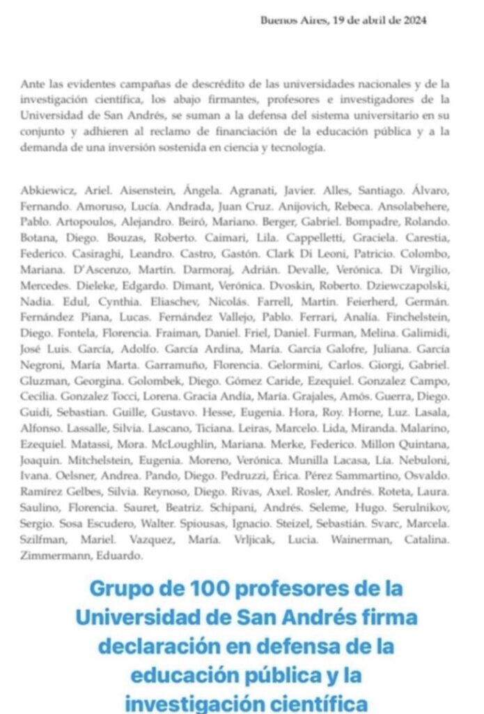 “Ante las evidentes campañas de descrédito de las universidades nacionales y de la investigación científica, los abajo firmantes, profesores e investigadores se suman a la defensa del sistema universitario en su conjunto y adhieren al reclamo de financiación de la educación pública y a la demanda de una inversión sostenida en ciencia y tecnología”, sostiene el texto, que no fue informado por los canales institucionales pero sí suscripto por centenares de docentes tanto de la Universidad de San Andrés como Torcuato Di Tella.