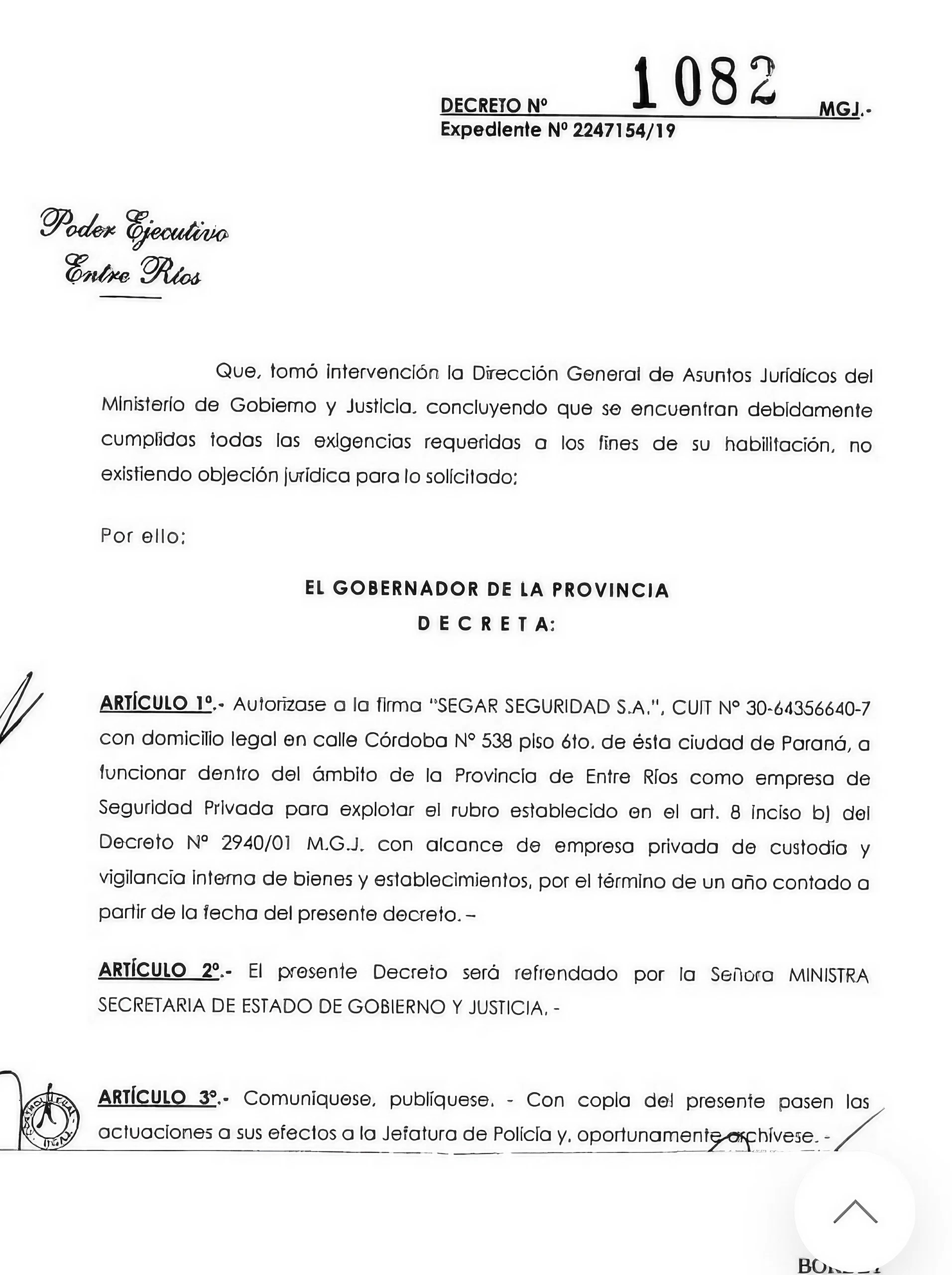 Por lo tanto, NO HAY MANERA de que en ENERSA haya sucedido algún hecho de COMPRA o CONTRATACIÓN SIN QUE GUSTAVO BORDET ESTÉ ENTERADO. Además, LO QUE POSIBILITÓ QUE LOS TÓRTUL VOLVIERAN A TOMAR EL SERVICIO DE SEGURIDAD DE ENERSA CON SU NUEVA EMPRESA, LLAMADA SEGAR, ES EL DECRETO N° 1082 MGJ, EXPEDIENTE N° 2247154/19, FIRMADO POR BORDET, CON EL QUE SE HABILITÓ, EN TIEMPO RECORD, A LOS HERMANOS TORTUL A OPERAR EN EL AMBITO DE LA PROVINCIA DE ENTRE RÍOS SIN HABER CUMPLIMENTADO LOS REQUISITOS NECESARIOS. SIN ESTE DECRETO, HECHO EN 48 HS, LOS TÓRTUL NO PODRÍAN HABERSE PRESENTADO EN LA LICITACIÓN, LA CUAL GANARON, A PESAR DE LAS IMPUGNACIONES DE LA OTRA EMPRESA QUE SE PRESENTÓ.