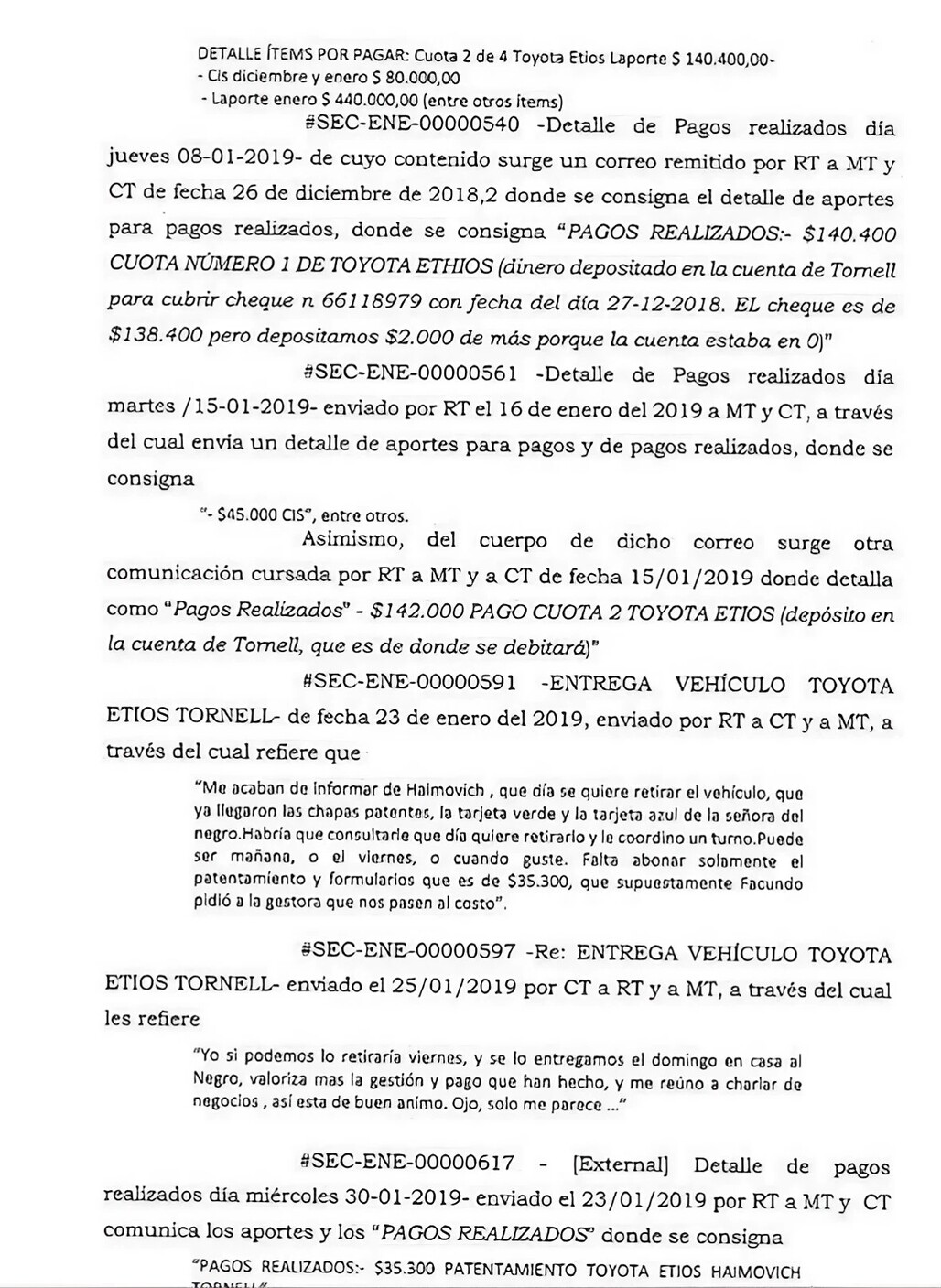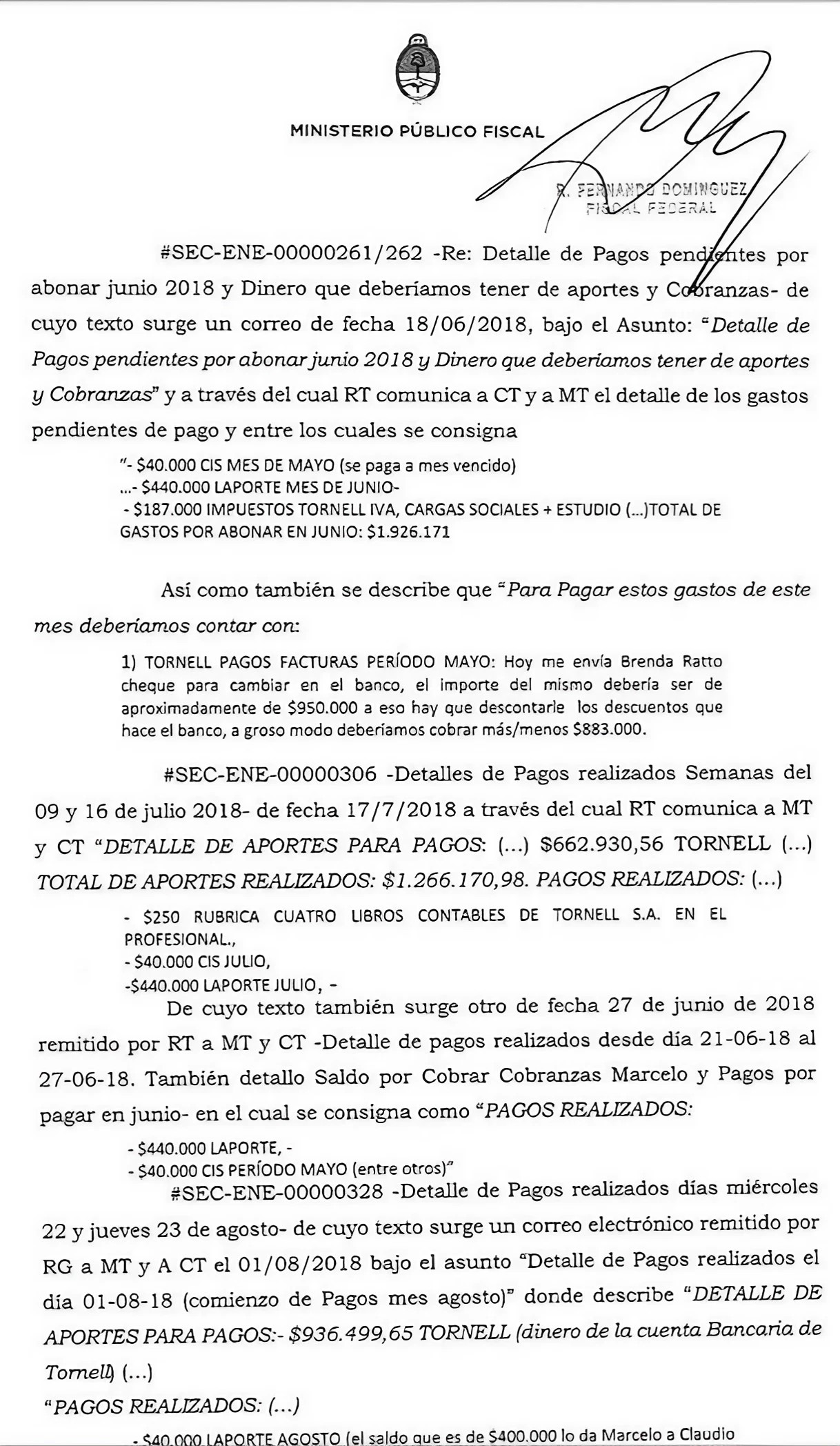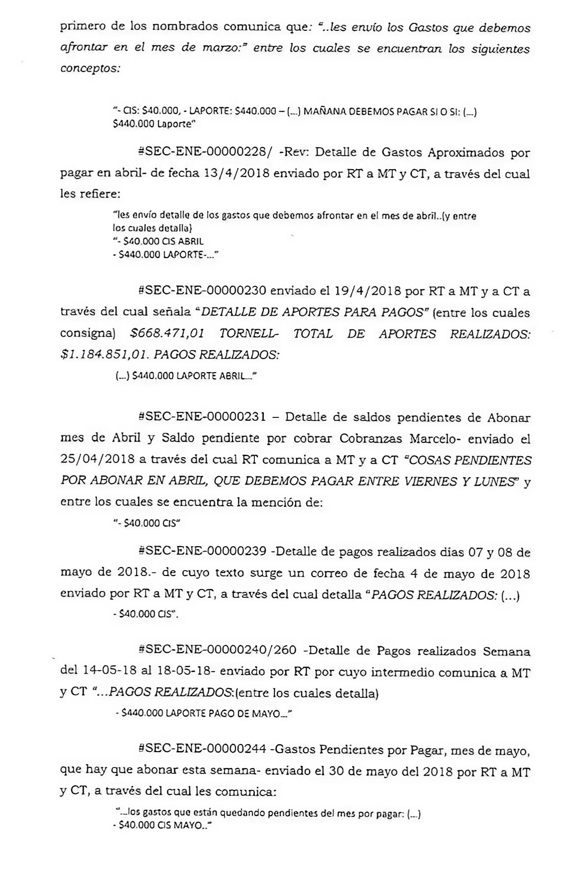 En otro correo fechado el 17 de julio de 2018, titulado «Detalles de Pagos realizados Semanas del 09 y 16 de julio 2018», Ramiro Tortul comunica a Marcelo Tortul y Claudio Tortul el detalle de aportes para pagos, donde se destaca: