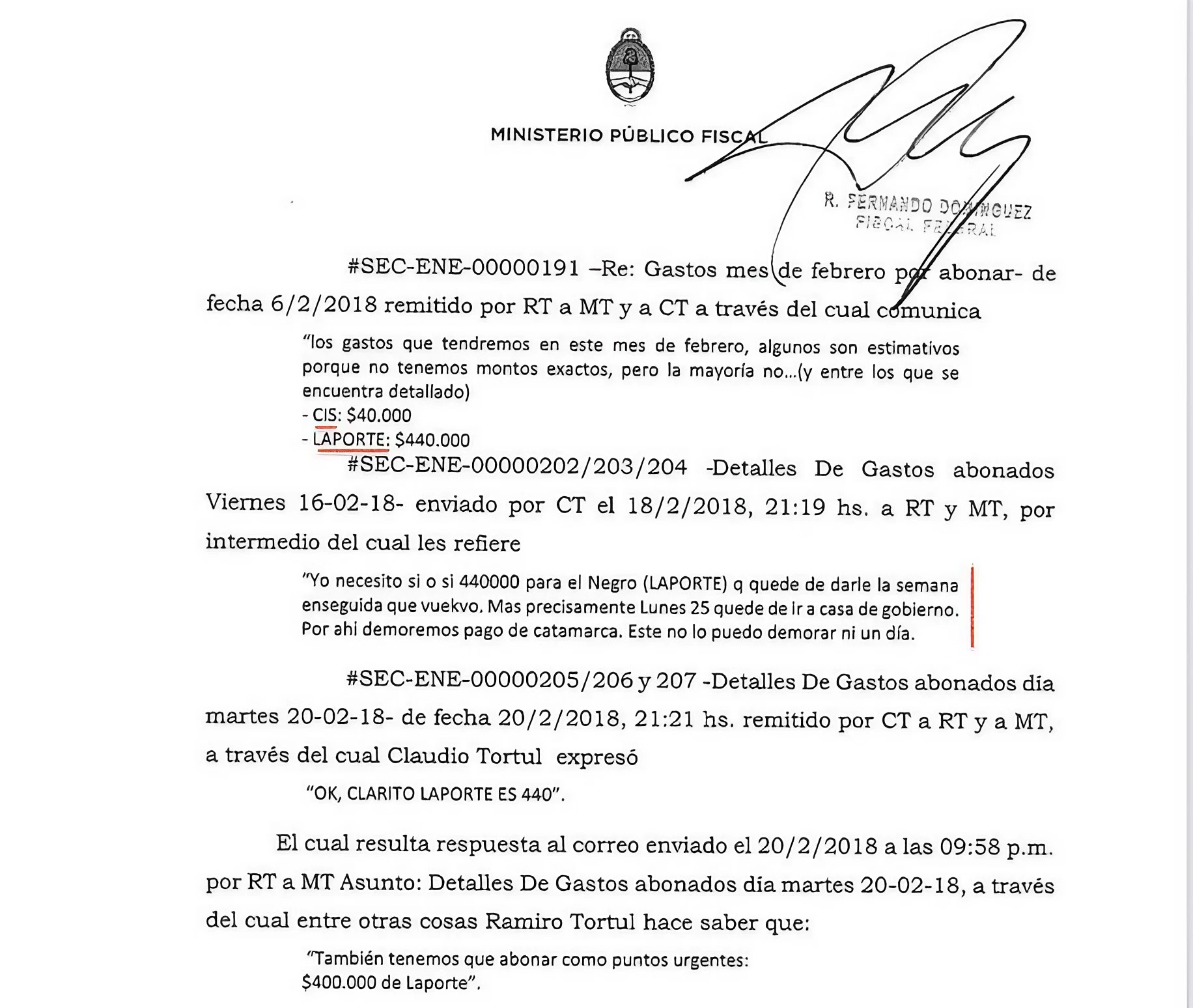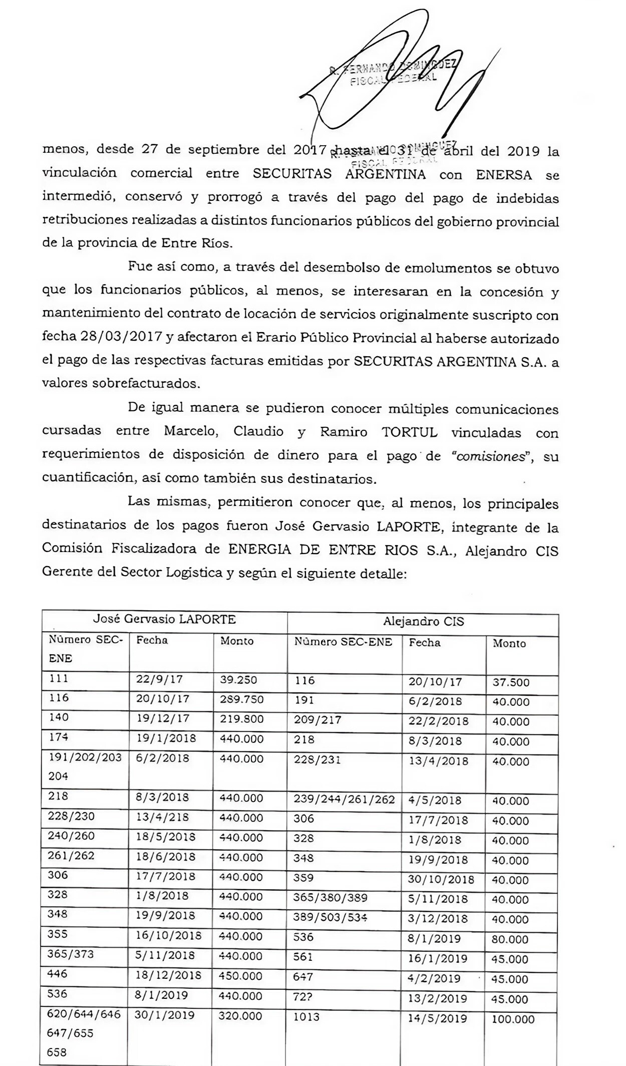 Se han descubierto múltiples comunicaciones entre Marcelo, Claudio y Ramiro TORTUL relacionadas con solicitudes de dinero para el pago de «comisiones», incluyendo su cuantificación y destinatarios. Principalmente, estos pagos fueron dirigidos a José Gervasio LAPORTE, miembro de la Comisión Fiscalizadora de ENERGIA DE ENTRE RIOS S.A., y a Alejandro CIS, Gerente del Sector Logístico.