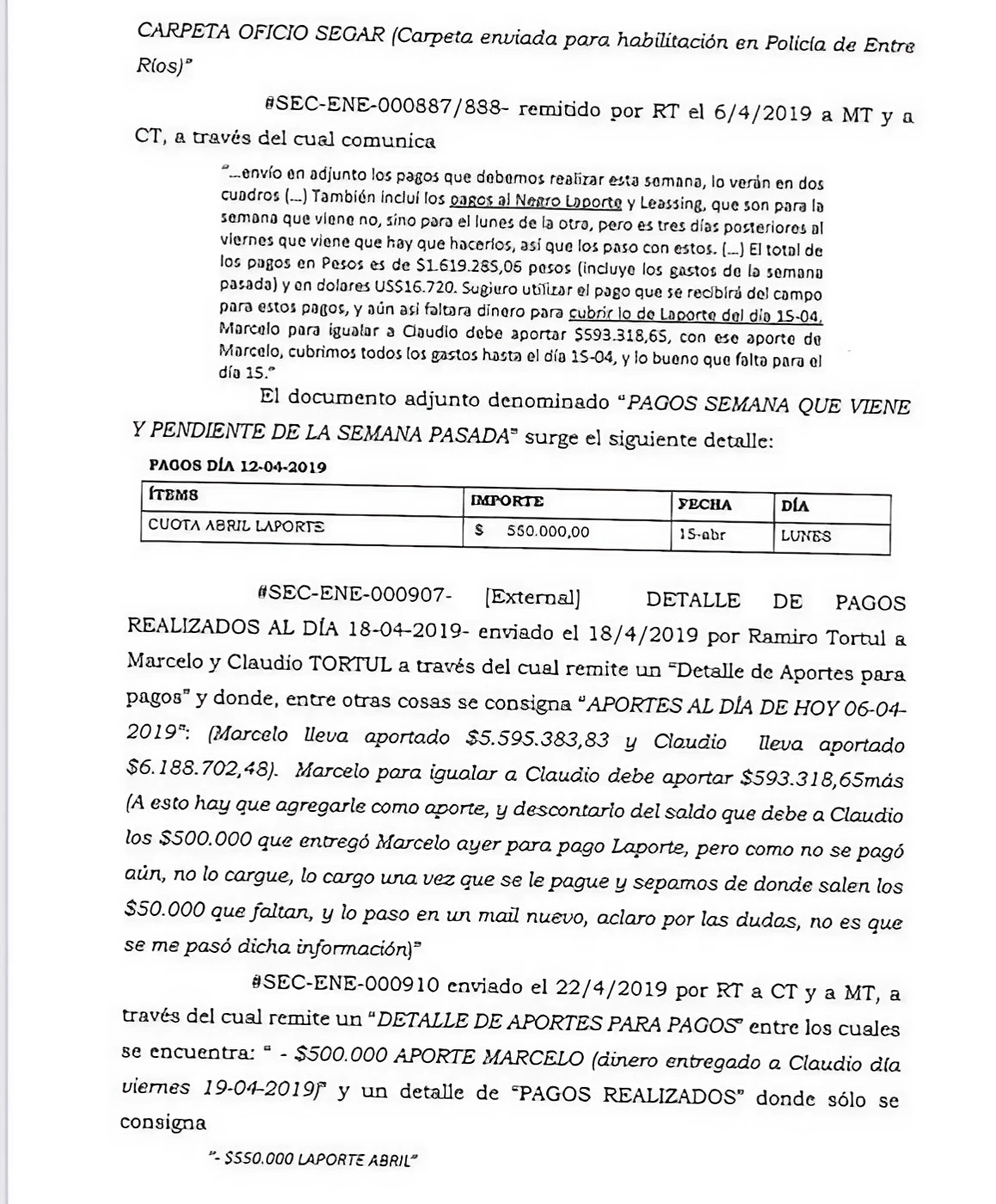 Enviado el 22 de abril de 2019 por Ramiro Tortul a Claudio Tortul y Marcelo Tortul, contiene un «Detalle de aportes para pagos», incluyendo un aporte de $500,000 de Marcelo entregado a Claudio el viernes 19 de abril, así como un detalle de «Pagos realizados», que solo incluye $550,000 para Laporte en abril.»