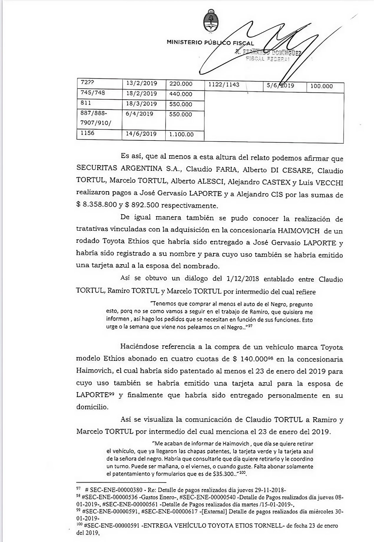 Se confirma que SECURITAS ARGENTINA S.A., Claudio FARIA, Alberto DI CESARE, Claudio TORTUL, Marcelo TORTUL, Alberto ALESCI, Alejandro CASTEX y Luis VECCHI realizaron pagos a José Gervasio LAPORTE y a Alejandro CIS por un total de $8,358,800 y $892,500 respectivamente. Además, se ha detectado la realización de negociaciones relacionadas con la compra de un vehículo Toyota Ethios en la concesionaria HAIMOVICH, el cual habría sido entregado a José Gervasio LAPORTE y registrado a su nombre. También se emitió una tarjeta azul para la esposa de LAPORTE para su uso. Se menciona un diálogo del 1 de diciembre de 2018 entre Claudio TORTUL, Ramiro TORTUL y Marcelo TORTUL, en el que se discute la compra del vehículo y se plantean preocupaciones sobre el trabajo de Ramiro. Se hace referencia a la compra del Toyota Ethios en cuatro cuotas de $140,000 en la concesionaria Haimovich, con registro de patente al menos el 23 de enero de 2019. Se menciona la comunicación de Claudio TORTUL sobre la entrega del vehículo y la necesidad de pagar el patentamiento y formularios restantes por $35,300.100. Además, se citan varios documentos relacionados con los pagos realizados y la entrega del vehículo Toyota Etios Tornell el 23 de enero de 2019.