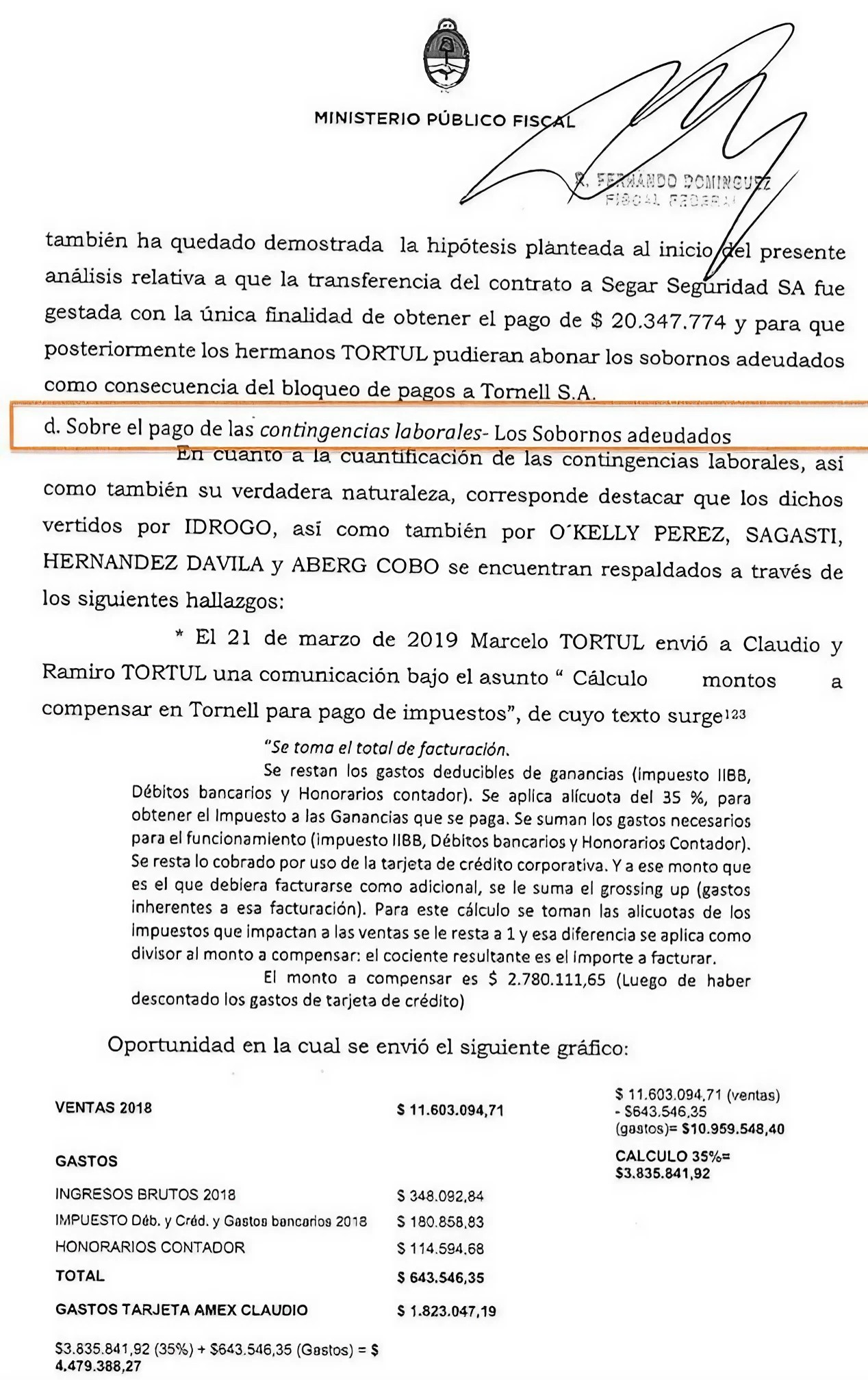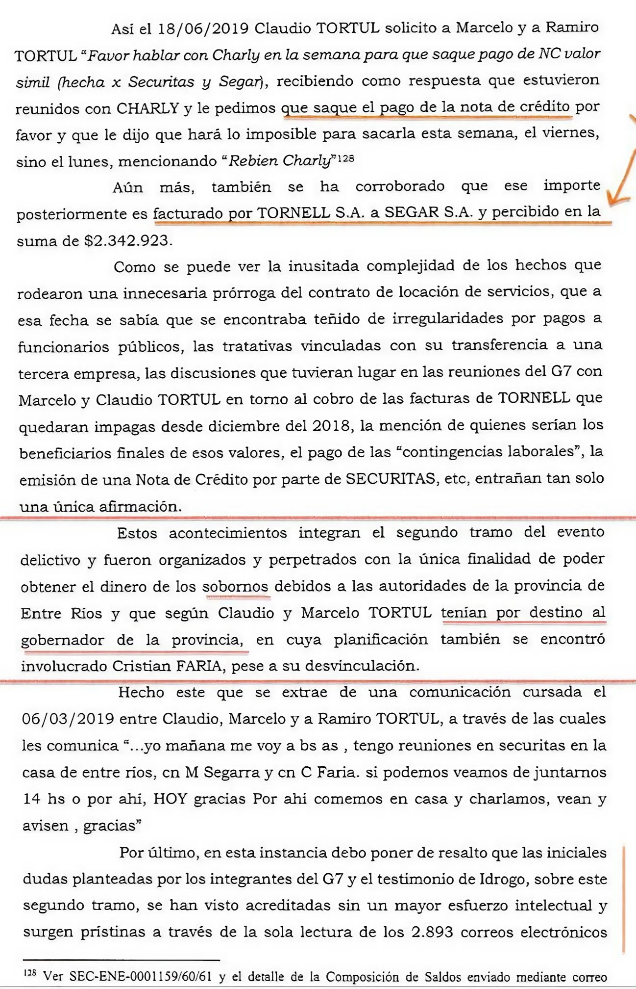 La complejidad inusitada de los eventos que rodearon una innecesaria prórroga del contrato de locación de servicios, ya conocida por estar teñida de irregularidades por pagos a funcionarios públicos, las negociaciones relacionadas con su transferencia a una tercera empresa, las discusiones en las reuniones del G7 con Marcelo y Claudio TORTUL sobre el cobro de las facturas impagas de TORNELL desde diciembre de 2018, la mención de los beneficiarios finales de esos valores, el pago de las «contingencias laborales», la emisión de una Nota de Crédito por parte de SECURITAS, entre otros, confirman una sola afirmación.