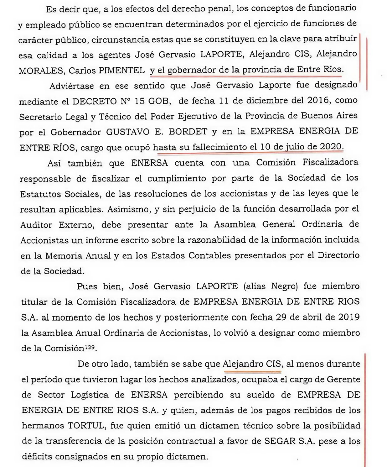 De lo observado en el Expediente, se desprende que el MAYOR COMPROMETIDO es José Gervasio Laporte, Secretario Legal y Técnico de Entre Ríos, y Síndico en ENERSA, hasta su fallecimiento. Bordet lo colocó en ese puesto porque era su hombre de confianza, fiel colaborador que cuidaba sus intereses en la empresa de Energía provincial. Por eso era el intermediario con los hermanosTórtul, y quien se reunía en Casa de Gobierno con ellos.