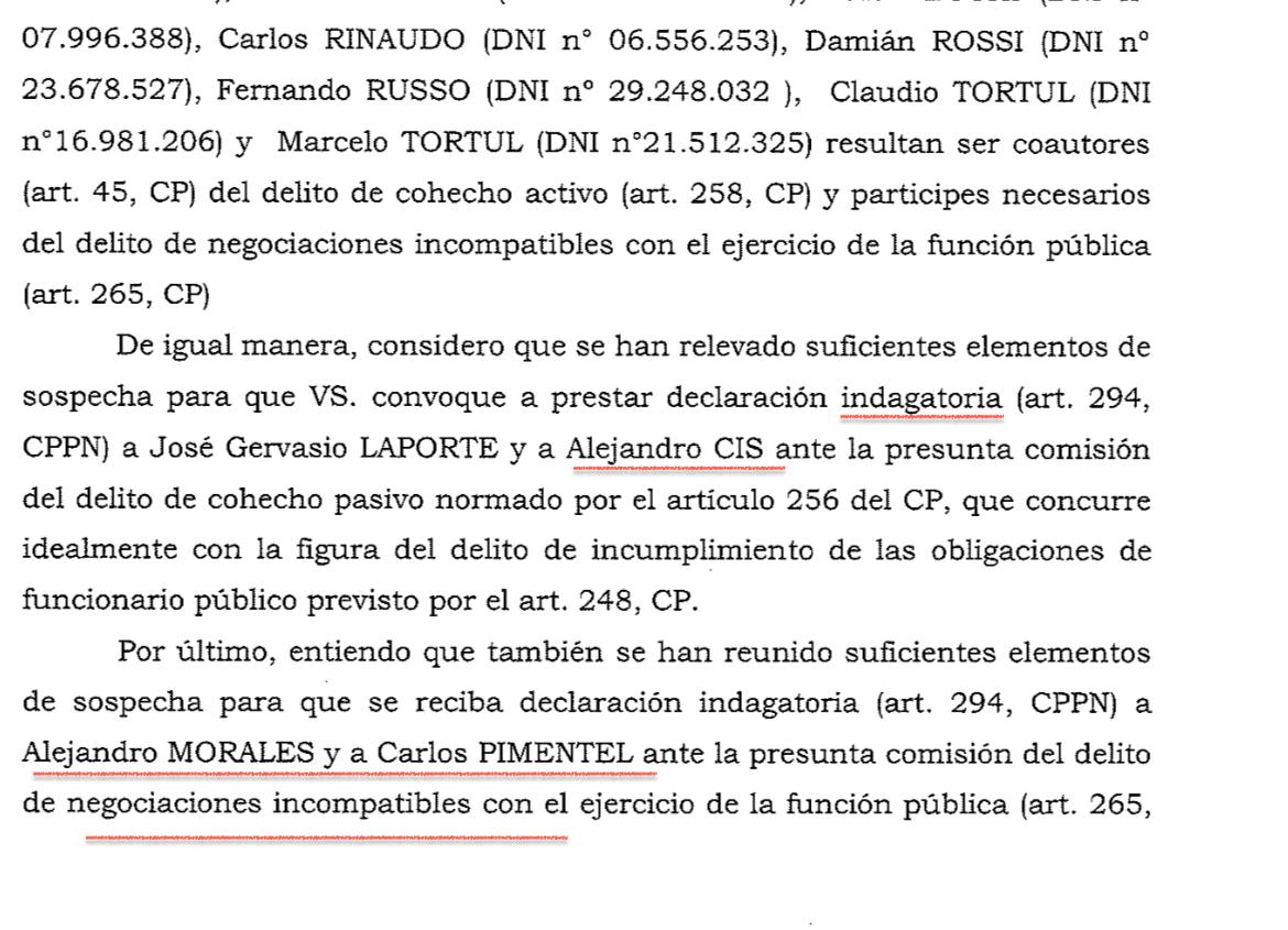Carlos RINAUDO, Damián ROSSI, Fernando RUSSO, Claudio TORTUL y Marcelo TORTUL son considerados coautores del delito de cohecho activo y participantes necesarios en el delito de negociaciones incompatibles con el ejercicio de la función pública. Por otra parte, considero que hay suficientes elementos para citar a declaración indagatoria a José Gervasio LAPORTE y a Alejandro CIS por presunto cohecho pasivo, en concurrencia con el delito de incumplimiento de las obligaciones de funcionario público. Además, se estima necesario recibir declaración indagatoria a Alejandro MORALES y Carlos PIMENTEL por la presunta comisión del delito de negociaciones incompatibles con el ejercicio de la función pública.