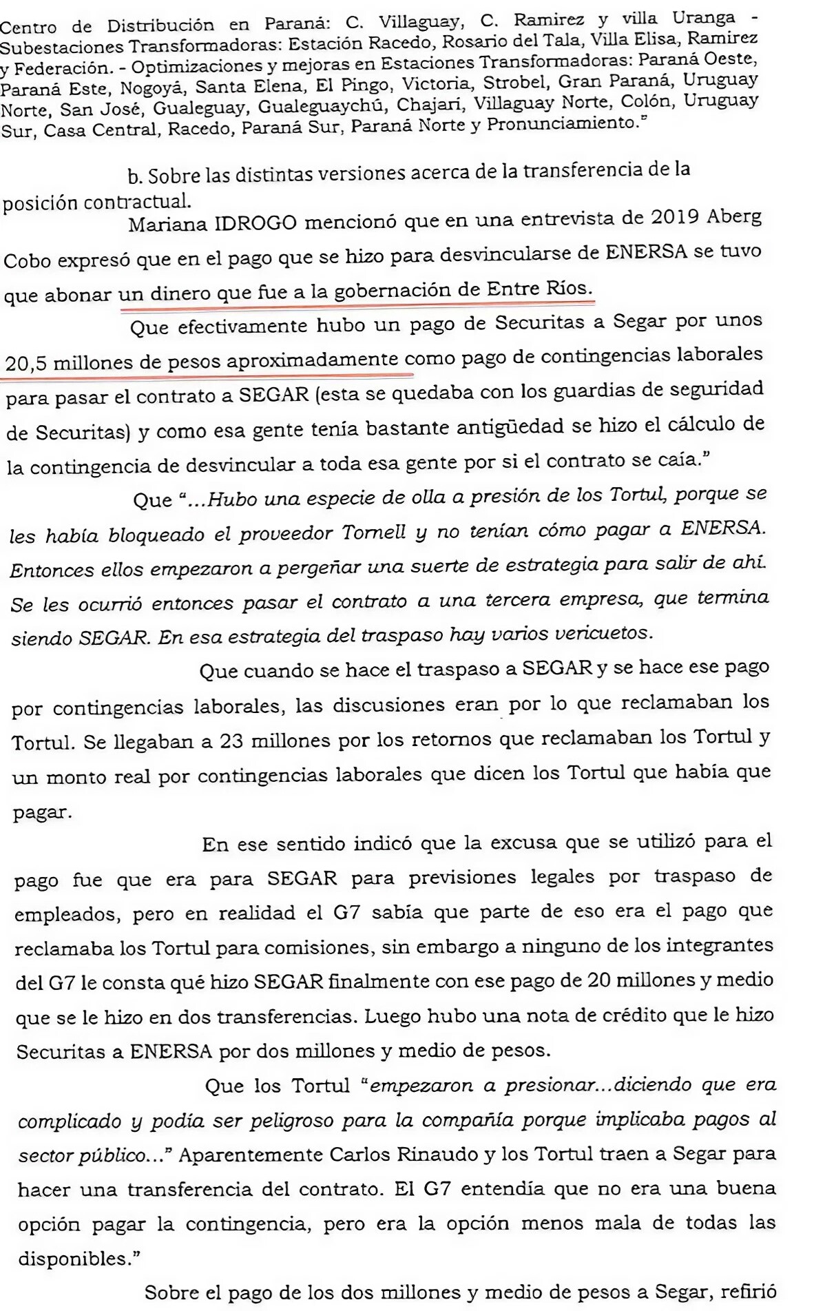 Aquí se menciona una serie de localidades y mejoras en infraestructura eléctrica, así como disputas relacionadas con la transferencia de contratos. Mariana Idrogo menciona una entrevista en la que Aberg Cobo habla sobre un pago realizado para desvincularse de ENERSA, involucrando a Securitas y Segar. Se discute un pago de contingencias laborales a Segar, presiones por parte de los Tortul y una transferencia de contrato a Segar. También se menciona un pago posterior de Securitas a ENERSA y preocupaciones sobre implicaciones legales y financieras.