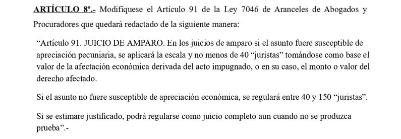 El otro artículo controversial es el 8°, que modifica al artículo 91 de la Ley 7046 de Aranceles de Abogados y Procuradores de la siguiente manera: En los juicios de amparo, si el tema involucra dinero, se aplicará una tarifa basada en el valor económico del caso, utilizando al menos 40 «juristas». Si no hay un valor económico definido, la tarifa se determinará entre 40 y 150 «juristas». En casos especiales, incluso sin prueba, se puede aplicar la tarifa completa del juicio si se considera justificado.