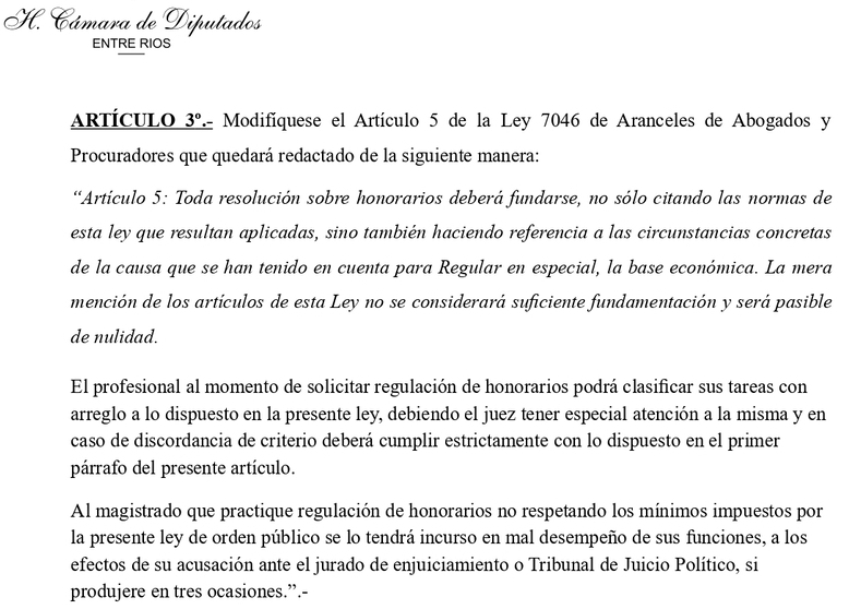El artículo 3° es significativo, ya que modifica al artículo 5 de la Ley 7046 de Aranceles de Abogados y Procuradores para exigir una justificación detallada de las decisiones sobre honorarios legales, basada en las circunstancias del caso. Los jueces deben considerar la clasificación de tareas realizada por los profesionales y seguir estrictamente los mínimos establecidos por la ley. Si un juez no cumple tres veces, puede ser acusado de mal desempeño.