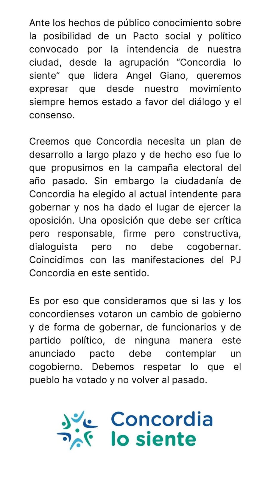 Ahora, tras el cimbronazo que provocó a nivel político provincial el acercamiento entre el gobierno actual de Concordia con dirigentes de la oposición, que pretende conciliar posiciones y beneficiar a la sociedad concordiense más allá de las diferencias partidarias, con el claro objetivo de atender las urgencias impostergables que sufre un gran sector de la sociedad, apareció en Redes Sociales un manifiesto hecho por el grupo encabezado por ANGEL GIANO, A QUIEN ASEGURAN FUENTES MUNICIPALES NUNCA SE LO CONVOCÓ, porque no se lo considera referente , ni de tener representación alguna.