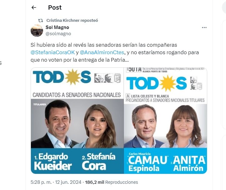 Edgardo Kueider ha logrado también fama, primero saltó a los medios nacionales en enero de 2023 cuando se apartó del bloque del PJ y dejó al peronismo sin la mayoría automática en el Senado, y ahora, hasta la mismísima Cristina se encargó de mostrar su repudio contra el accionar de Kueider jugando para el oficialismo, y dando cuenta de que esto no hubiera sucedido si la que encabezaba la lista en 2019 hubiera sido Stefanía Cora. Mismo trato le dió a Espínola, el correntino complice de bloque de Kueider.
