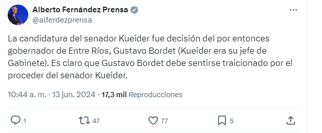 Hasta Alberto Fernández salió a aclarar que la NO TUVO NINGUNA INGERENCIA con la inclusión de Kueider como candidato a Senador en 2019, porque en Redes Sociales se le estaba echando la culpa de haber incidido para que Kueider sea candidato. Es más, el PJ nacional, en especial Fernández, se mostró muy molesto con la candidatura de Kueider en 2019, y la rispidez se doblego después del resultado desastroso en los comicios, que hicieron perder una banca al PJ.