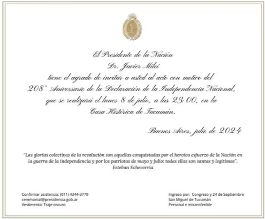 Si bien el Gobierno anunció que junto al acto por el Día de la Independencia se firmará el Pacto de Mayo, en las invitaciones que comenzó a cursar, solo menciona la actividad en Tucumán para el lunes próximo, a las 23. La consigna es vestir “traje oscuro”.