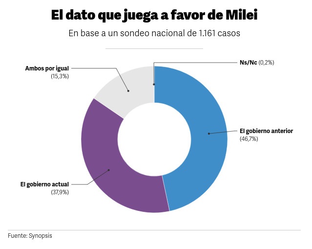 Sin embargo, el libertario mantiene a su favor un dato clave que también miden las consultoras, sobre todo cuando se producen cambios de administración con distinto color político. ¿Quién tiene la culpa por la crisis actual? Lo llamativo es que aunque ya pasaron más de siete meses de la nueva gestión, la acusación más grande se la sigue llevando el gobierno anterior.
