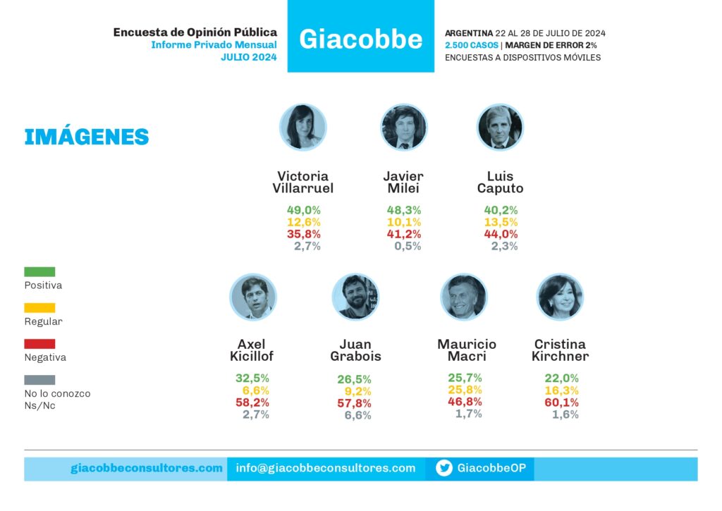 En el sondeo de Giacobbe, realizado entre el 22 y el 28 de julio entre 2.500 casos consultados a través de dispositivos móviles, Javier Milei vualve a quedar debajo de la vicepresidenta por segundo es consecutivo. Mile apenas supera el 48% de iagen positiva y Victoria Villarruel ya alcanza el 49%. Mucho más atrás se ubica el ministro de economía Luis Caputo con apenas dos puntos más del 40%.