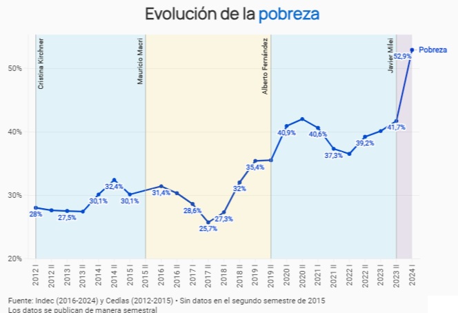 La pobreza llegó al 52,9% en la Argentina en el primer semestre de 2024, según publicó este jueves el Instituto Nacional de Estadística y Censos (INDEC). De esta manera, el nivel de pobreza subió 11,2 puntos porcentuales con respecto del último semestre del 2023 y afectó a casi 25 millones de personas. Sin embargo, el panorama es distinto de acuerdo a la región.