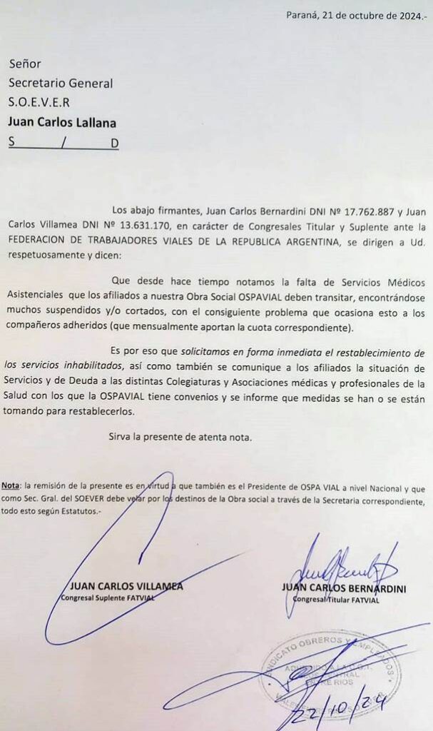 La nota de reclamo, que hicieron llegar a nuestra redacción, está dirigida al actual secretario general de SOEVER, Juan Carlos Lallana, quien es además el presidente de la OSPA Vial a nivel nacional.